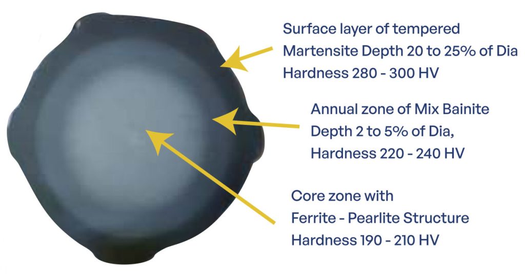 The German Thermex Technology involves a brief but precise in-line cooling of the rolled bar, resulting in a hardened outer layer. Subsequent cooling facilitates thermal exchange (THERMEX) between the inner and outer surfaces of the bar. This process creates a distinct tempered martensite layer on the outer surface and a fine-grained ferrite-pearlite structure in the core, ensuring optimal performance and durability.