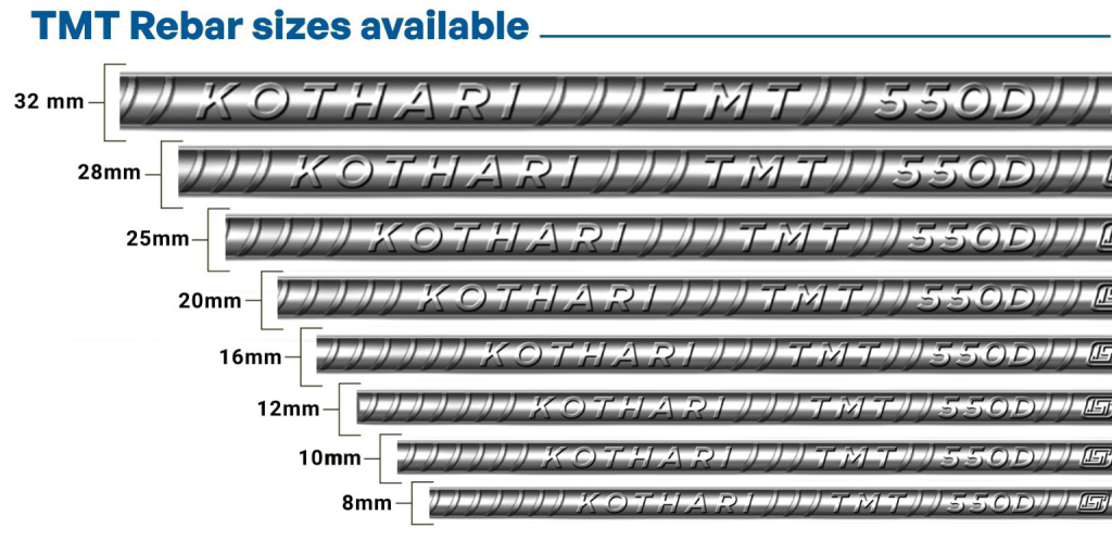 Kothari TMT Rebars are available in the following sizes as per: 1786-2008 for Concrete Reinforcement.